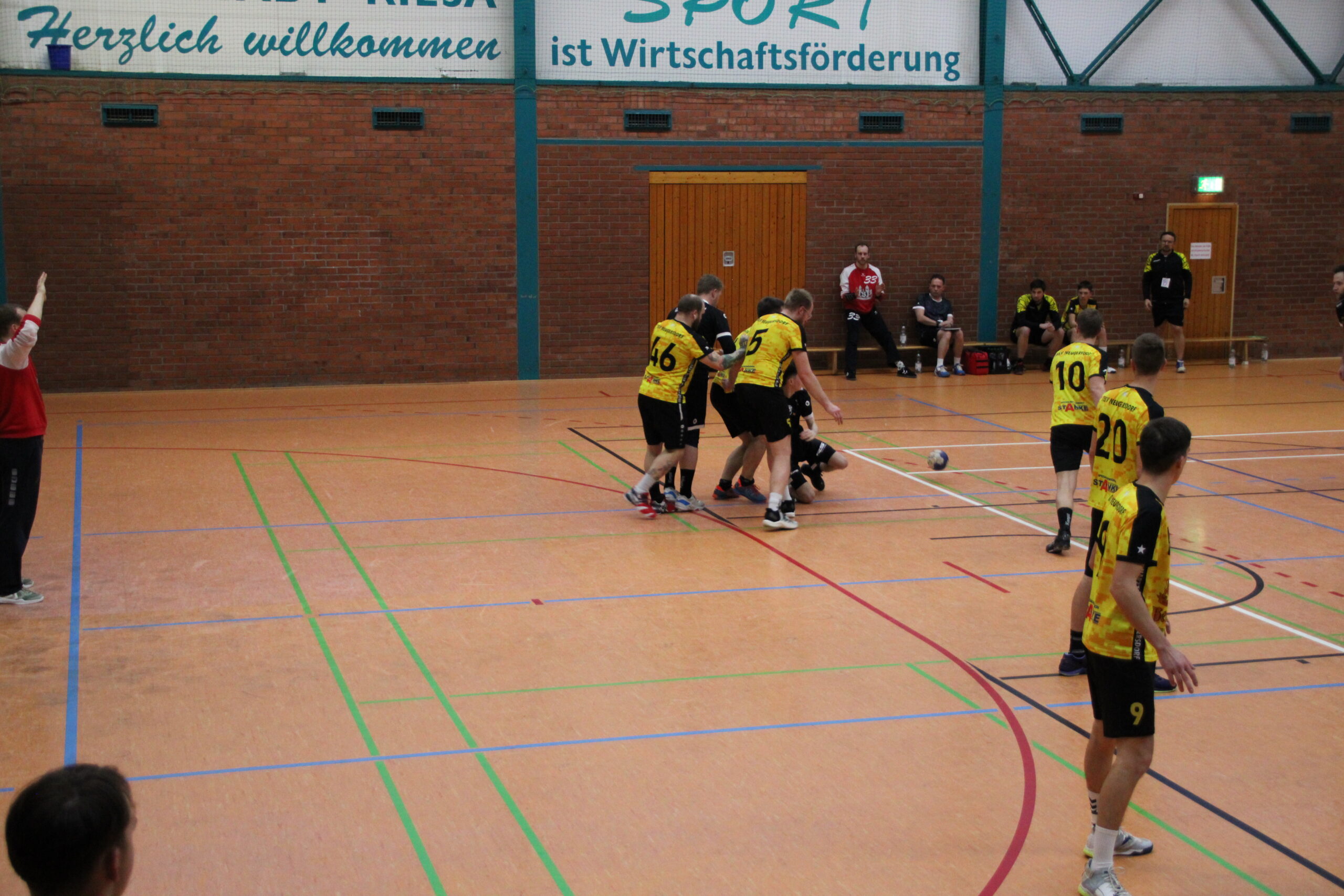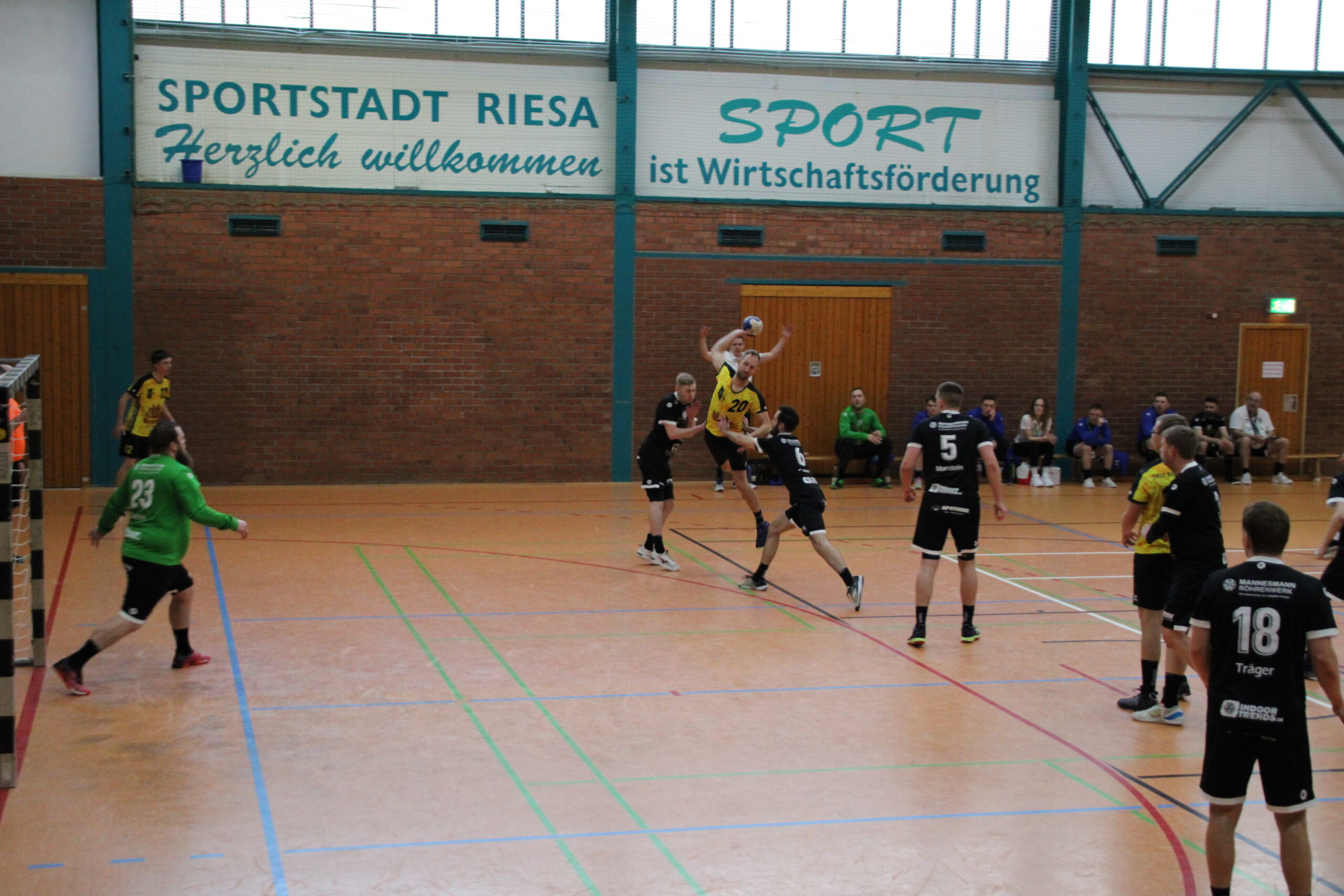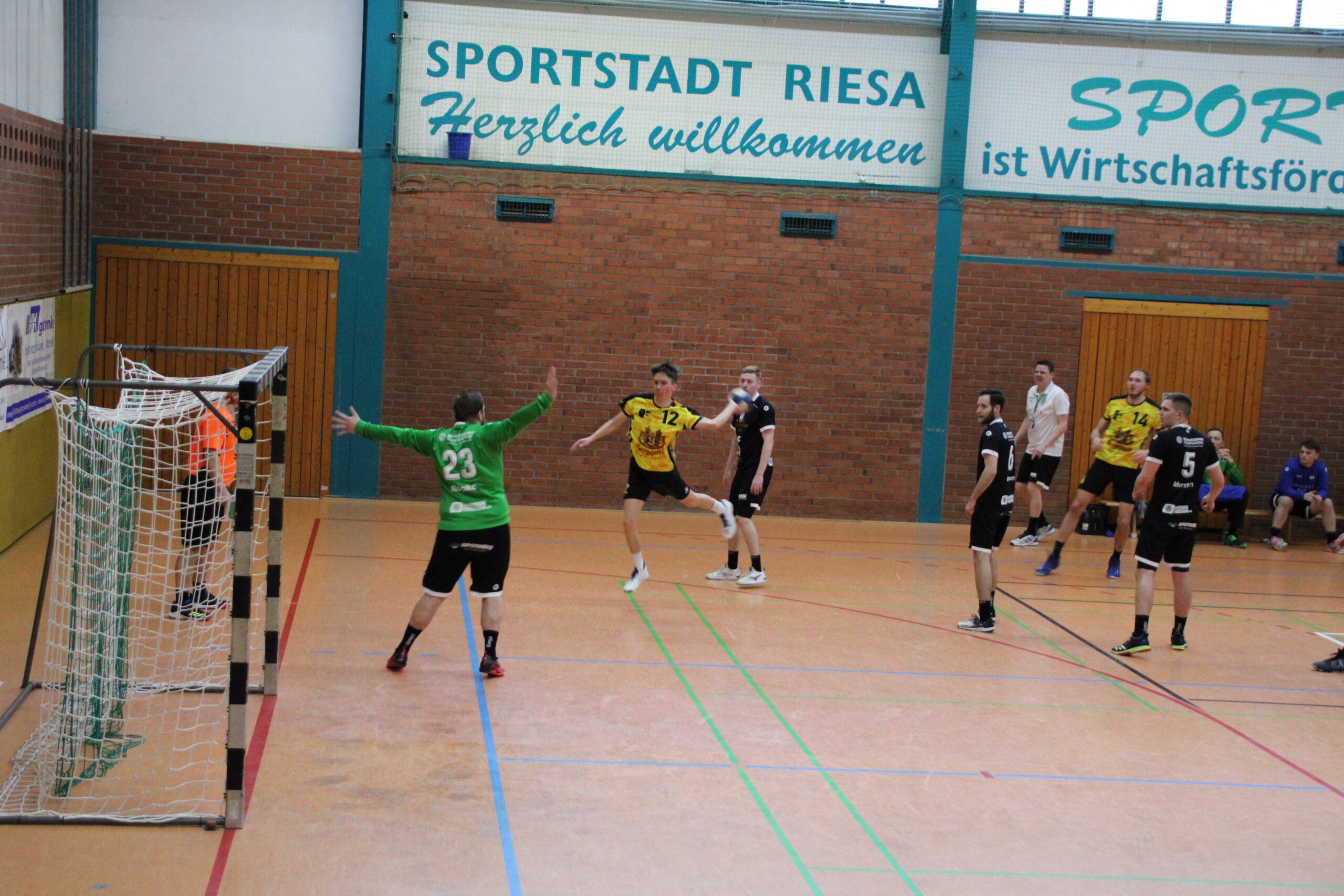 Vielversprechend startete das TBSV-Team, wo erst einmal Oliver Aßmann die Regie auf Rückraum Mitte übernehmen sollte. Mit konzentrierten Aufbauspiel und bestens verwerteten Würfen überrumpelte man die Riesaer in den ersten zehn Minuten (2:6). Die Gastgeber berrapelten sich, und nutzten nun jeden sich bietenden Fehler des TBSV. Zum Glück bewahrte uns Olli im Tor mit Paraden vor einem zu schnellen Ausgleich. Zu verhindern war es aber nicht, ebenso das es einen Führungswechsel gab(7:7, 8:7). Unkonzentriert und teils mit zu wenig Druck bespielte man die Riesaer Abwehr. Auch die richtige Wurfauswahl wurde nun weniger, da mussten ein paar Würfe von Konrad her, die mit purer Gewalt ins Tor gesetzt wurden. Man blieb ergebnistechnisch dran, auch weil eine Abwehr-Umstellung dem Riesaer Rückraum nun die zu einfachen Aktionen verwehrte. Einer durchaus lockeren Linie der Schiedsrichter, standen Strafen entgegen, die im Handball im Allgemeinen als normales Foul bewertet würde. Leidtragender war Konrad, der zur Pause schon zweimal auf der Bank Platz nehmen musste. Dennoch war bei einem 15:13-Halbzeitstand noch alles drin und möglich.