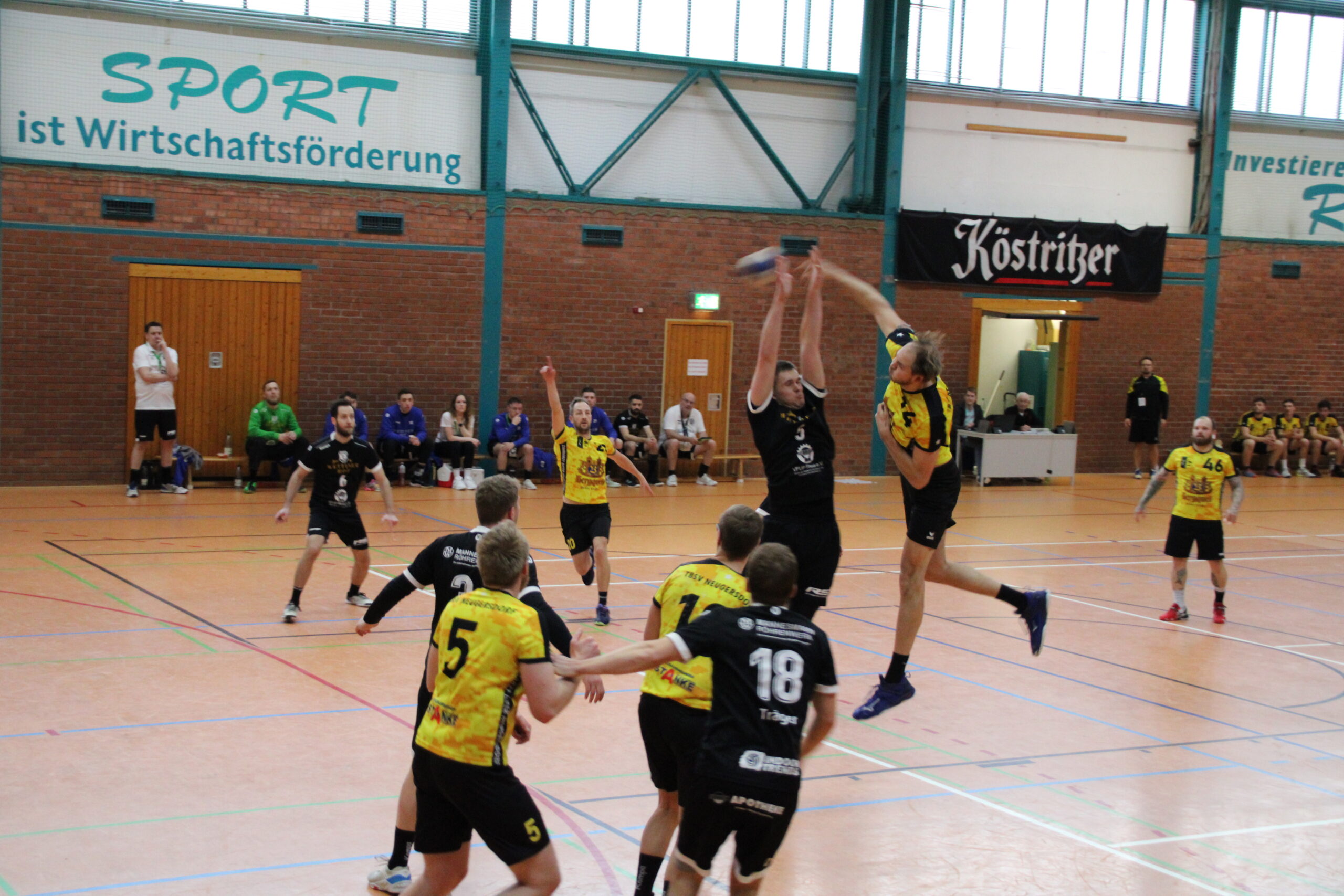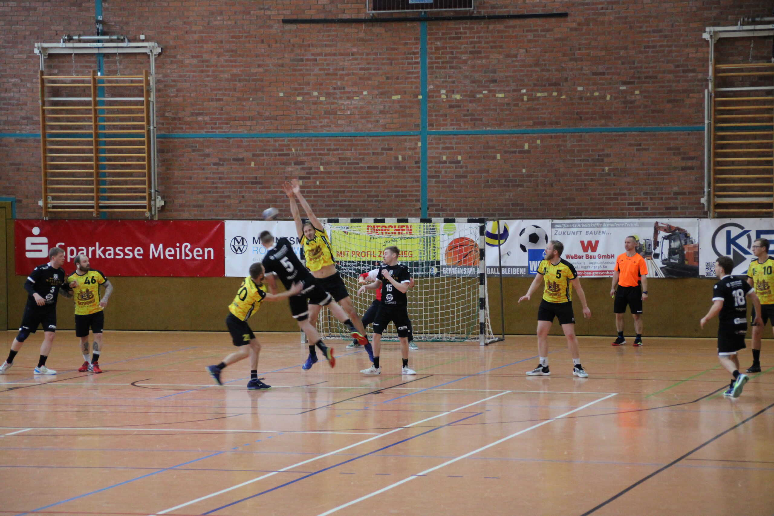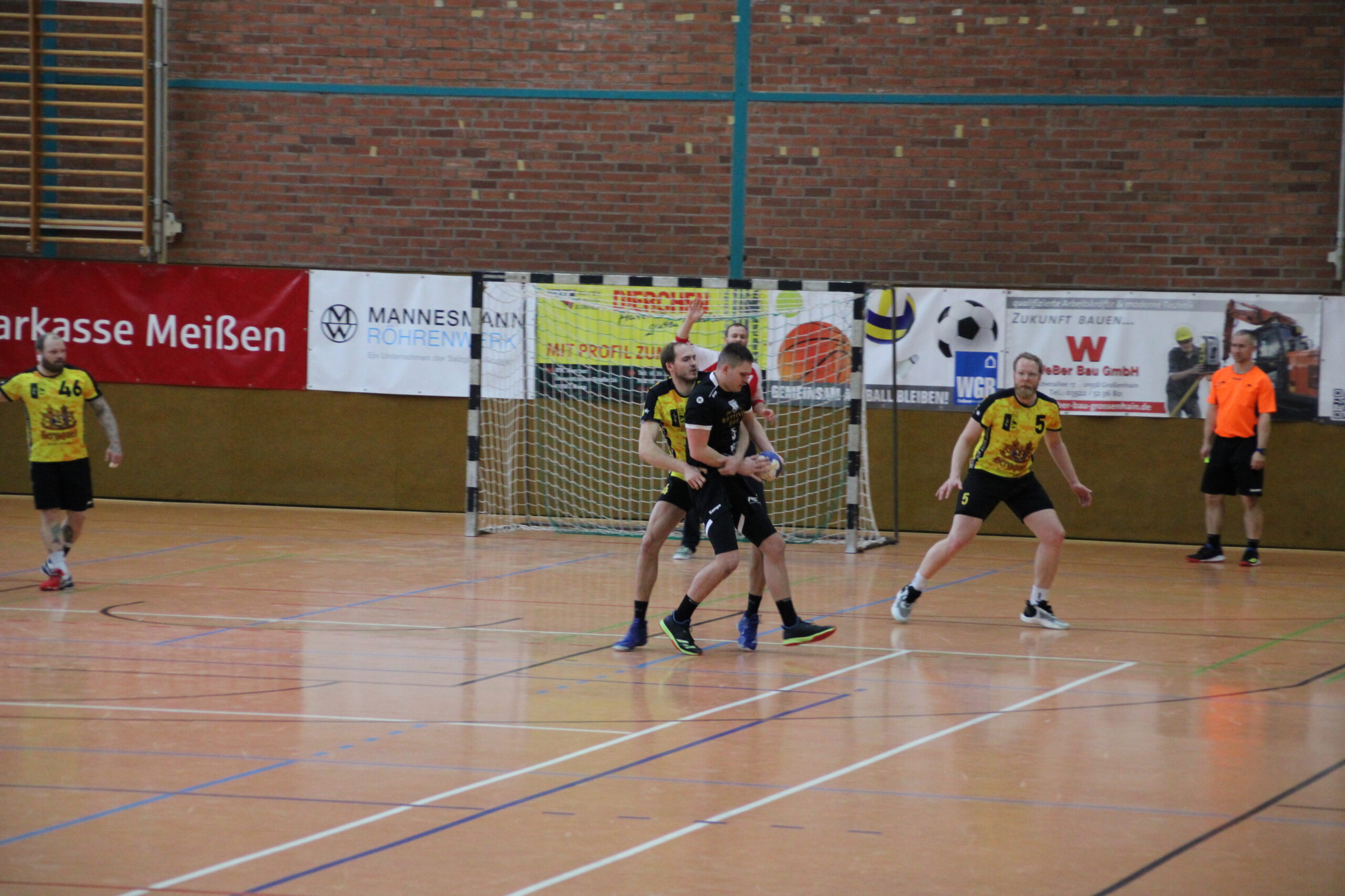 Vielversprechend startete das TBSV-Team, wo erst einmal Oliver Aßmann die Regie auf Rückraum Mitte übernehmen sollte. Mit konzentrierten Aufbauspiel und bestens verwerteten Würfen überrumpelte man die Riesaer in den ersten zehn Minuten (2:6). Die Gastgeber berrapelten sich, und nutzten nun jeden sich bietenden Fehler des TBSV. Zum Glück bewahrte uns Olli im Tor mit Paraden vor einem zu schnellen Ausgleich. Zu verhindern war es aber nicht, ebenso das es einen Führungswechsel gab(7:7, 8:7). Unkonzentriert und teils mit zu wenig Druck bespielte man die Riesaer Abwehr. Auch die richtige Wurfauswahl wurde nun weniger, da mussten ein paar Würfe von Konrad her, die mit purer Gewalt ins Tor gesetzt wurden. Man blieb ergebnistechnisch dran, auch weil eine Abwehr-Umstellung dem Riesaer Rückraum nun die zu einfachen Aktionen verwehrte. Einer durchaus lockeren Linie der Schiedsrichter, standen Strafen entgegen, die im Handball im Allgemeinen als normales Foul bewertet würde. Leidtragender war Konrad, der zur Pause schon zweimal auf der Bank Platz nehmen musste. Dennoch war bei einem 15:13-Halbzeitstand noch alles drin und möglich.
