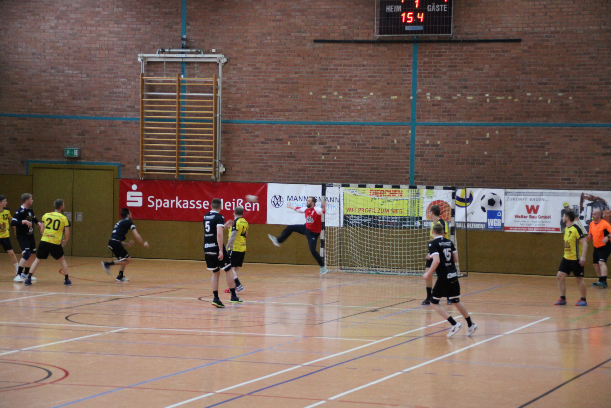 Mit Enthusiasmus und Engagement sollte man in die 2. Halbzeit starten, um nach 2 Minuten ganz bitter bestraft zu werden. Denn Konrad bekam nach einer etwas ungeschickten Abwehr-Aktion nun schon die 3. Zeitstrafe und war raus. Das war so ziemlich der Anfang vom Ende. Was nun folgte, waren wirklich schwache 20 Minuten des TBSV. Nicht nur das diese Phase mit 17:6 vorüber ging, kamen auch noch eine Menge Fehler hinzu, die abgezockt und schmerzlich klar von Riesa bestraft wurden. Teils fehlendes Tempo, wenig Beweglichkeit, oder auch zögerlich bei den Aktionen an den Strafraum heran, verlor man Angriff um Angriff, und kassierte zu schnell, zu viele Gegentore. Stefan im Tor, war bis zum Ende bemüht, es so glimpflich wie möglich zu gestalten. Bei den ständigen Konterläufen wurde Er und die Abwehr leider zu oft überlaufen. Auch der Abwehr-Riegel des TBSV war in der 2. Halbzeit nicht so stabil, auch weil das vorzeitige Raustreten nicht immer die richtige Wahl war. In der Mitte wurde man auch 1-2 mal richtig vom starken Riesaer Max Camen vernascht und sah dementsprechend schlecht aus. Immerhin zeigte der TBSV in der zweiten Hälfte einige Anspiele an den Kreisspieler Nick, der fast alle Würfe in Tore umwandelte. Auch ein paar ansatzlose Würfe aus dem Rückraum fanden das Ziel, so gelangen immerhin 25 Tore am Ende. Und auch die Schmach des 40. Gegentores konnte man sich wiedersetzen. Der Hallensprecher forderte zwar die Spieler mehrfach dazu auf, doch da auch Riesa manchmal einen Fehler machte, gehörte die Schlussminute dem TBSV und es gelangen noch 2 letzte Tore. 39:25 war der Endstand.