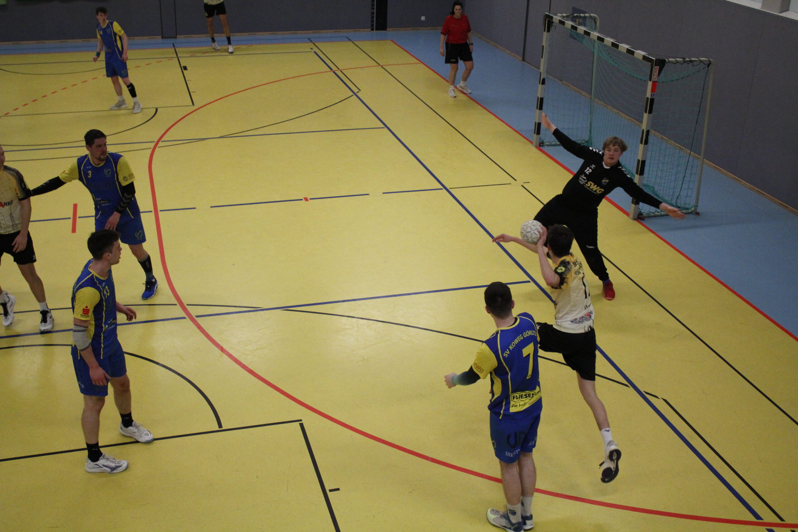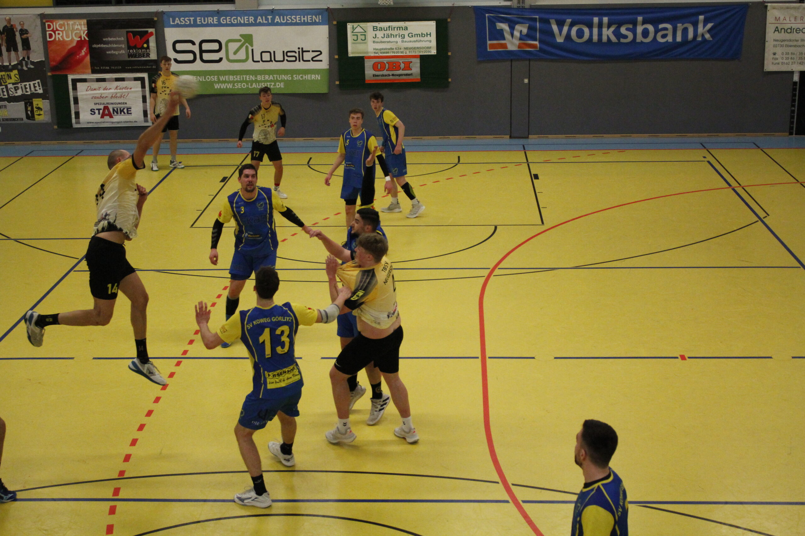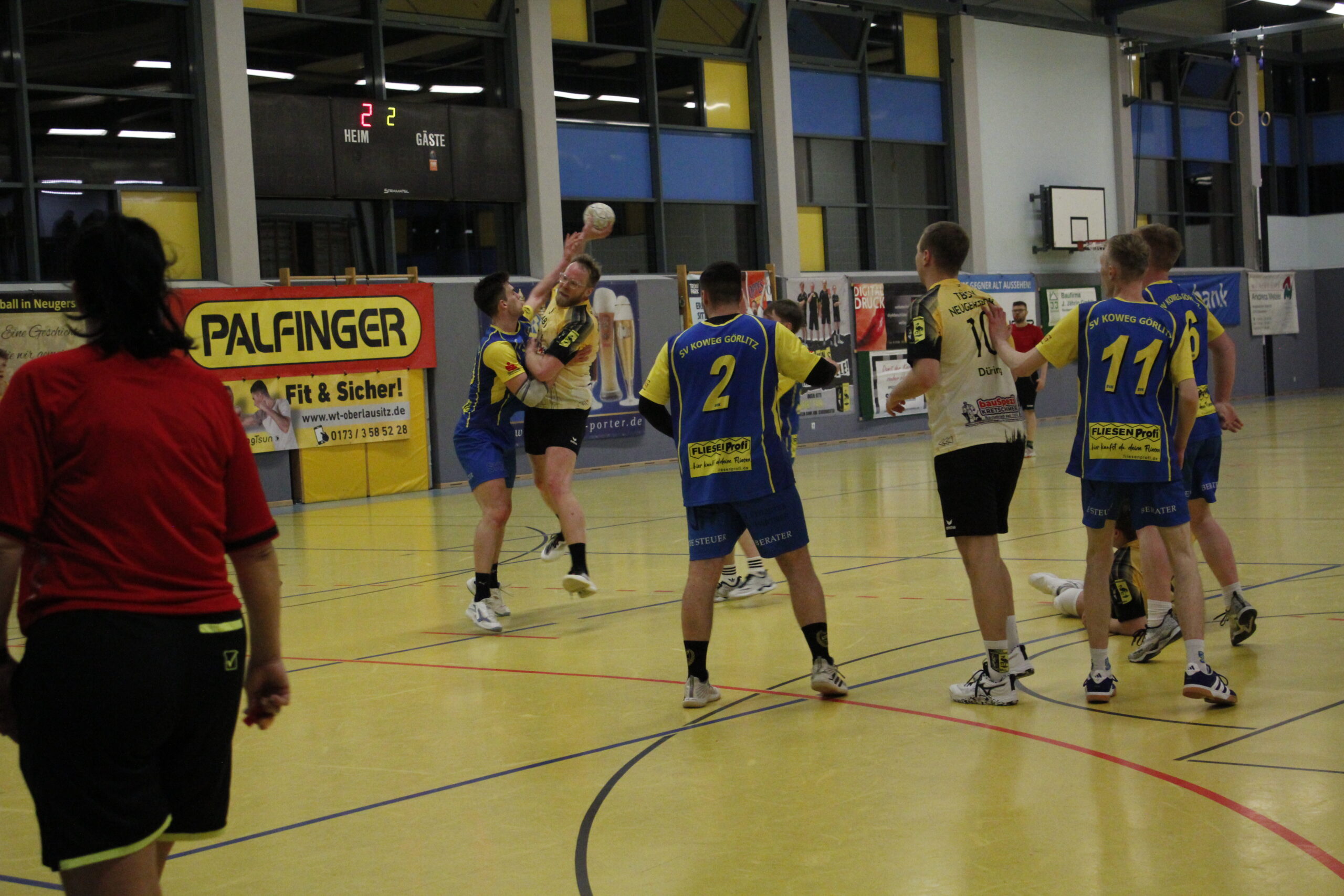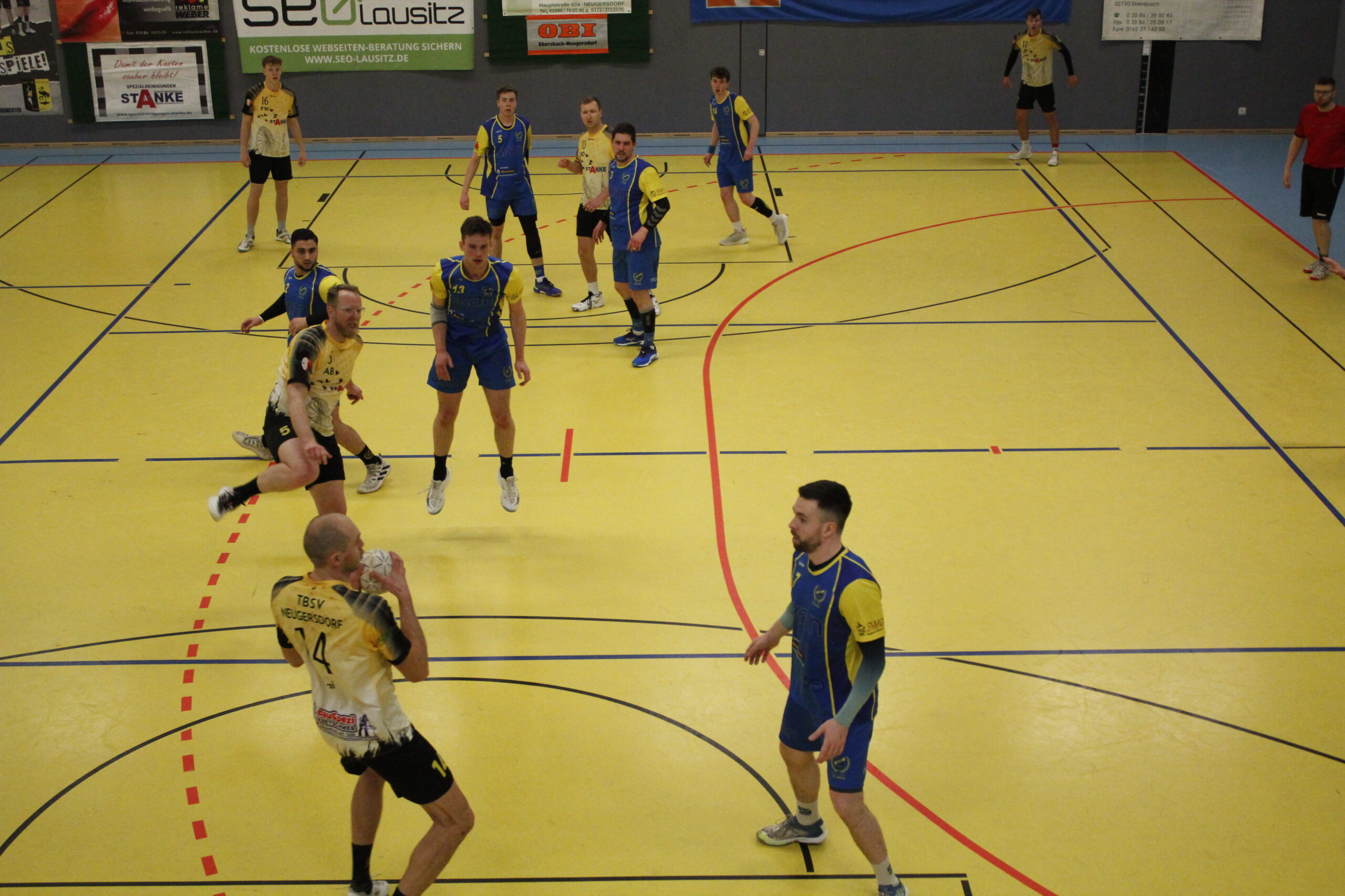 Und dann ging es los. Gleich mit einer ersten Unterzahl-Situation für Neugersdorf. Doch schon die überstand man sehr gut, dank stabiler Abwehr. Eine erste Auszeit nahmen die Gäste, ein paar feurige Ansagen gab es aber auf beiden Seiten. Görlitz spielte temporeiche und in die Tiefe gehende Angriffe und konnte erfolgreich aus dem Rückraum abschließen. Dagegen fand man noch nicht die richtige Abwehr-Variante, leidtragender war Olli, der keine Hände an den Ball bekam. Torwart-Wechsel folgte. In dieser Phase ereilte Nick nun auch schon seine zweite Zeitstrafe (8. Min.). Darauf musste die Bank reagieren. Es entwickelte sich eine enorm torreiche Partie, wobei die Angriffe so schnell aufeinander folgend waren, dass schnell die ersten 20 Tore insgesamt erreicht wurden. Nach der Auszeit des TBSV ging es nun abwechselnd hin und her. Eine stetig besser agierende Abwehr drängte Görlitz mehrmals bis zum Zeitspiel und Stefan hielt nun wichtige Würfe. Dennoch konnte sich kein Team absetzen, immer wieder Remis oder maximal ein Tor Vorsprung für eins der beiden Teams. Leider verpasste Tim beim Strafwurf den Ausgleich zur Pause, also nahmen die Gäste ein 21:22 in die Kabine.